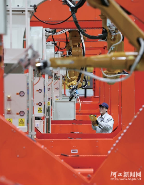 12月12日,在唐山开元自动焊接装备有限公司组装车间,技术人员调试焊接机器人系统。该生产线可通过多个机器人协作完成汽车起重机臂的全自动焊接。
