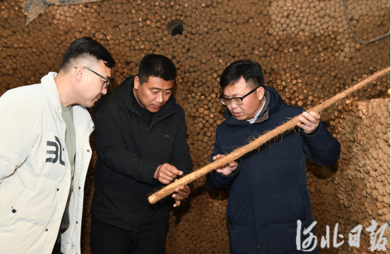 12月17日,在阿里数字乡村蠡县麻山药产业园的冷库内,刘廷辉(右一)在检查山药储存情况。河北日报记者 徐华 摄