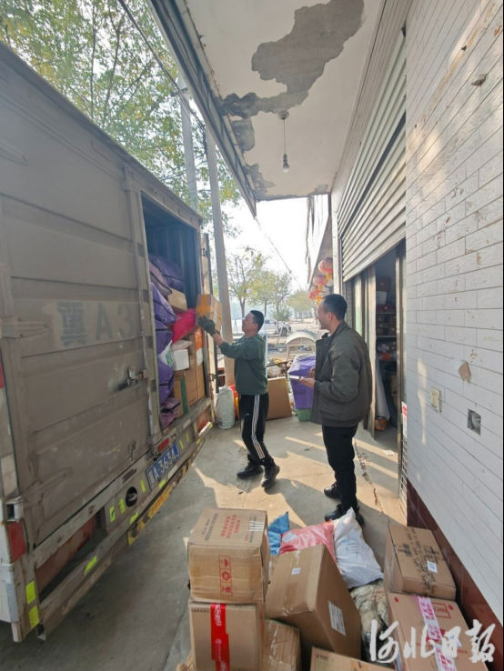 11月12日上午,无极县张段固镇东南丰村快递驿站门口,张满红(右)正在与快递运输车司机一起卸货。