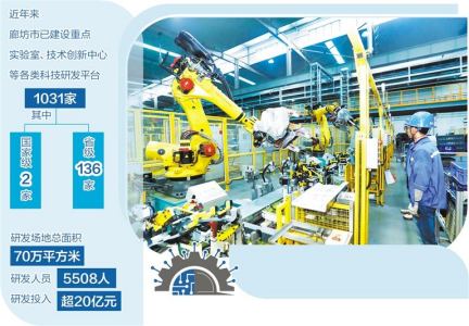 近年来,廊坊市大力推进特色产业集群数字化、智能化转型升级,推动产业向高端化、智能化、绿色化发展。全市已建设重点实验室、技术创新中心等各类科技研发平台1031家,其中国家级2家、省级136家;研发场地总面积70万平方米,研发人员5508人,研发投入超20亿元,年均实现技术突破230次以上,带动工业投资和技术改造投资持续增长。