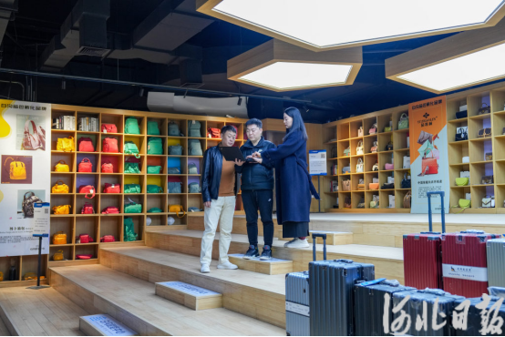 11月27日,白沟箱包数字化转型赋能中心工作人员(左二)向商户展示通过共享设计平台生成的效果图。