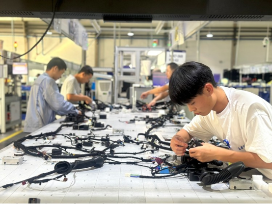 三河市廊坊莱尼线束系统有限公司车间内,工人们正在进行线束组装。