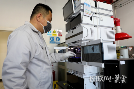 鼎材科技工作人员把发光材料放进液相色谱仪测试。