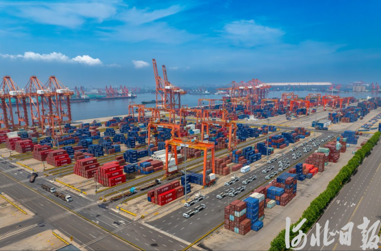 2025年7月8日,唐山港京唐港区集装箱码头一派繁忙景象。