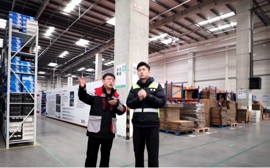 客户把他的产品放在咱们的前置仓,我们进行了资源整合,这边就是我们商品校验复核的环节,在这边复核完之后的话,会通过“上仓下中转”的专用通道,直接到了咱们的转运中心。(所谓的“上仓下转”就是上方是仓库,下方是转运?)对,是这个意思。(就是下单即发货,一条龙式服务。)