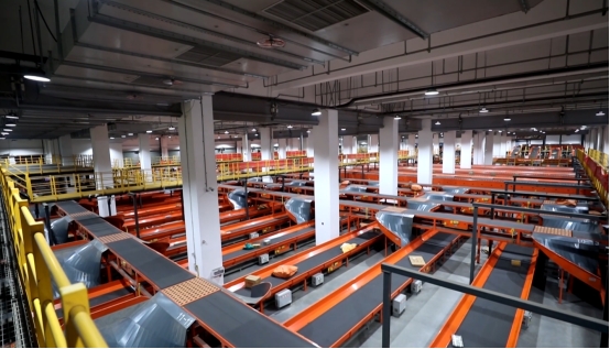 在顺丰廊坊开发区转运中心,二层是与客户合作设立前置仓,快件可通过滑槽快速到达一层分拣场地,节省了前期装车、卸车环节,从揽收到分拣只需5分钟。