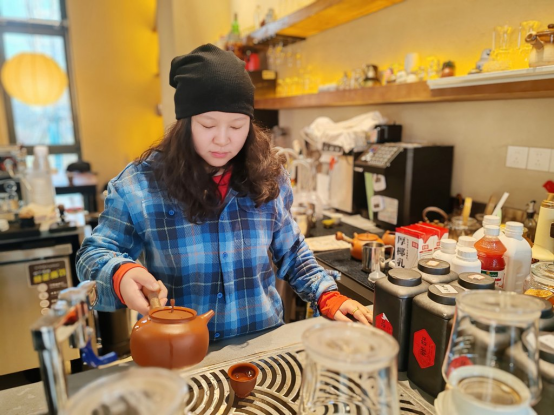 2025年12月23日,杨雷在自己创办的店铺十时安茶酒肆内忙碌。2025年8月开业以来,该店铺吸引了大量年轻人打卡。