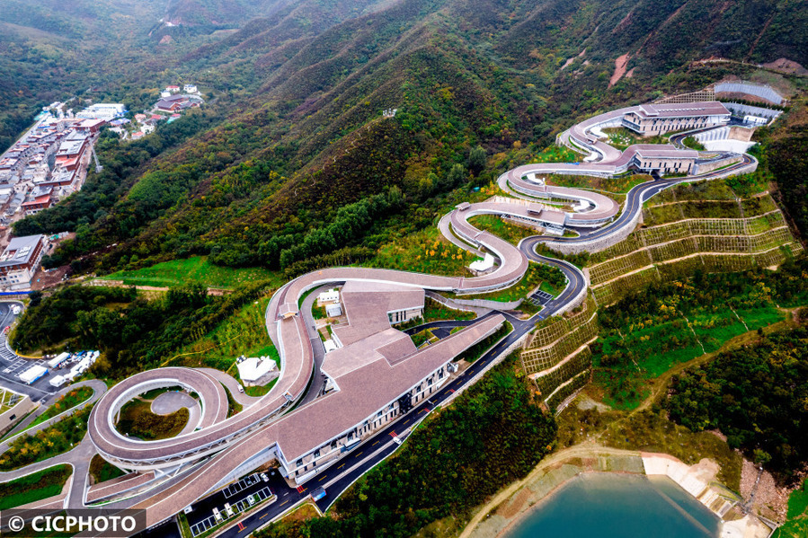 2021年10月6日拍摄的北京2022年冬奥会延庆赛区国家雪车雪橇中心。(无人机航拍)CICPHOTO/王子瑞 摄