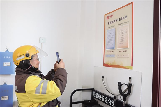 在“互动友好”型小区新就业群体门岗驿站,外卖员扫码签写文明配送承诺书。