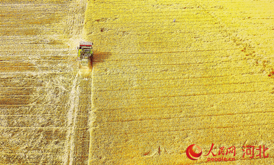 2021年6月5日,邯郸市临漳县兵马寨农业示范田基地内,小麦收割机正在进行夏收作业。 冯静摄