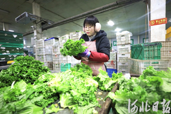 1月15日,固安县顺斋瓜菜种植专业合作社工作人员正在分拣生菜。