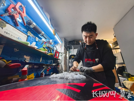 墙上挂着的专业蜡师证书格外醒目,这是米嘉轩创业十年的“底气”。“雪板就像雪友的‘脚’,必须保养到位,刃要磨得锋利,蜡要打得均匀,这样滑起来才安全又顺畅。”他一边说着,一边用抛光机打磨雪板表面,发出均匀的嗡嗡声。