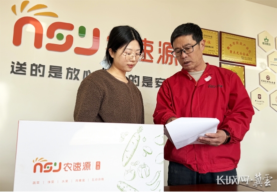 邢永亮(右)和同事核对净菜加工订单对接情况。