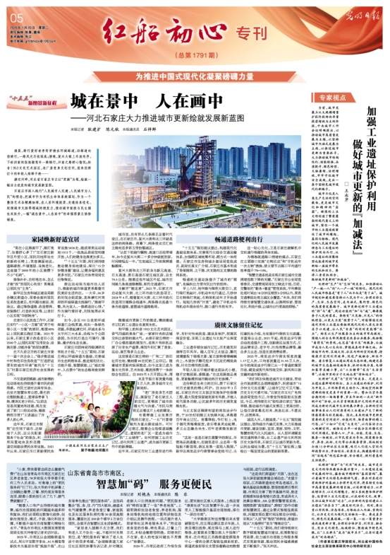 城因人兴,人随城美。“十五五”规划建议提出,坚持城市内涵式发展,大力实施城市更新,建设创新、宜居、美丽、韧性、文明、智慧的现代化人民城市。从人居环境蝶变到交通网络升级,从工业遗产活化利用到历史文脉传承,石家庄正以城市更新为笔、以民生福祉为墨,在“十五五”新征程上描绘出一幅宜居宜业的美丽新图景。