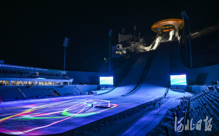2021年12月4日,国家跳台滑雪中心在灯光映射下流光溢彩熠熠生辉,“雪如意”魅力十足。河北日报记者耿辉摄