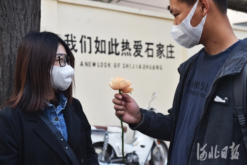 2021年10月30日,石市裕华区煤机街文化墙上演的浪漫一幕。河北日报记者赵杰摄