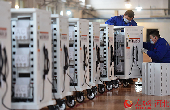 河北海捷现代教学设备公司车间工作人员正在组装智能充电车。 苑立伟摄