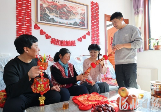 1月31日,吕晓哲(右一)、王亚(右二)为家里精心准备了年节饰品。