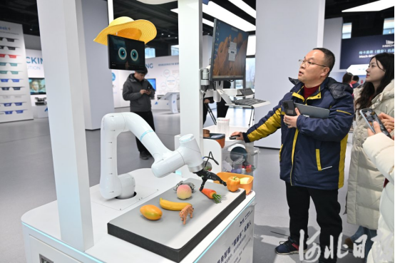 2月2日,雄安人工智能产业园,工作人员演示智能“眼脑手”机器人理解语言指令,自主完成复杂任务。