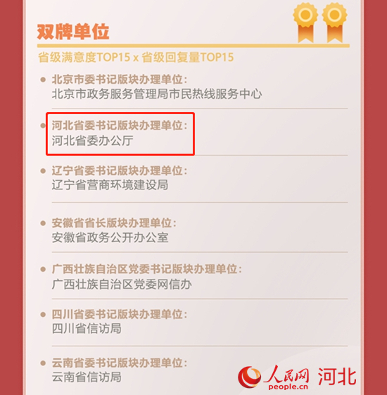2021年,河北省委书记、省长留言版块办理单位双双入围“2021年度人民网网上群众工作民心汇聚单位”省级满意度top15榜单。