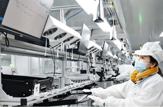 1月23日,位于雄安科创中心中试基地的雄安百信信息科技有限公司生产车间内, 工作人员正在检验生产线上的产品。