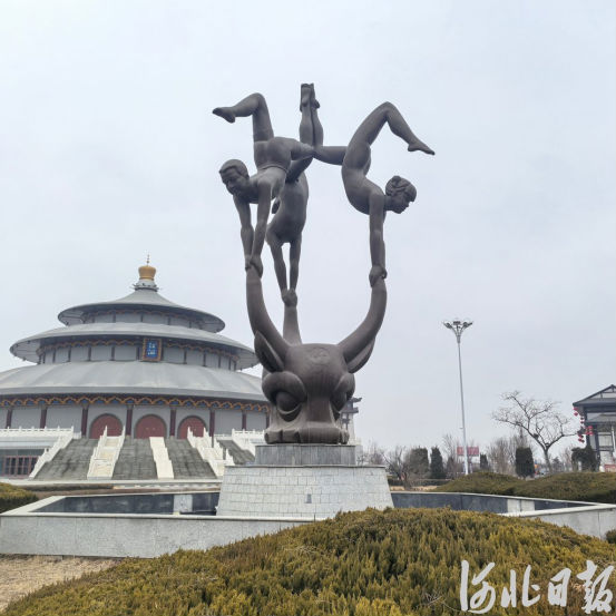 1月29日,吴桥杂技魂雕塑静静矗立,其后的江湖大剧院里,每日精彩上演的《江湖・秀》用全新的舞台表达艺术诠释吴桥杂技创新之魂。