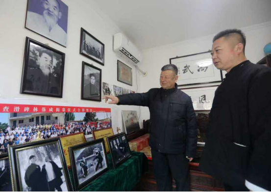 2月4日,张志刚(左)展示家中与武术相关的照片资料。
