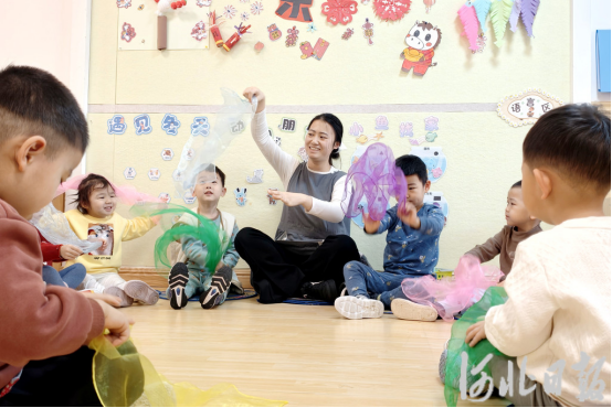 1月13日,在衡水市桃城区小萝卜托育中心,保育老师带着孩子们做游戏。