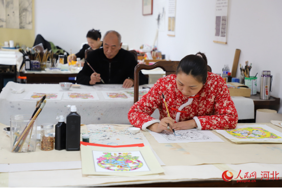河北衡水武强县汇名轩木版年画非遗工坊内,年画艺人们正在对年画作品润色。