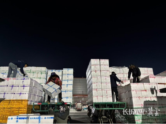 货车引擎轰鸣、板车隆隆作响、泡沫箱碰撞声交织,在零下7摄氏度的寒风中,奏响了独特的保供“交响曲”。