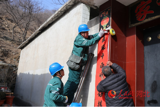 国网赞皇供电公司嶂石岩服务站贾立杰和同事在帮村民贴春联。