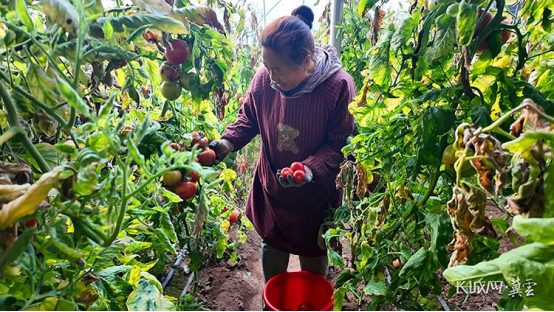 一大早,塔元庄村的果蔬种植大棚内,工作人员正在摘西红柿。