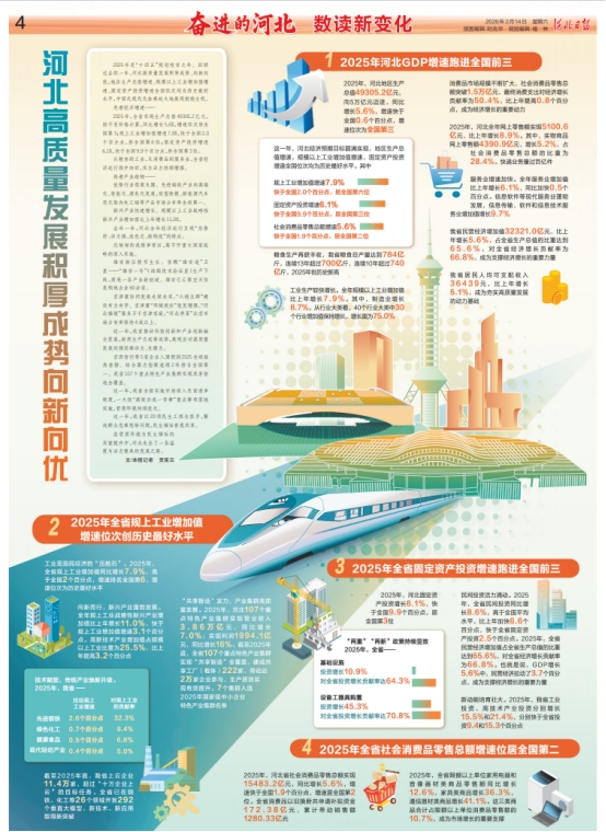 2025年是“十四五”规划收官之年。回顾过去的一年,河北高质量发展积厚成势、向新向优,地区生产总值增速、规模以上工业增加值增速、固定资产投资增速全国位次均为历史最好水平,中国式现代化在燕赵大地展现勃勃生机。