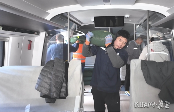 装卸工人张力和伙计们将一袋袋沙袋扛进崭新的京雄快线列车里。
