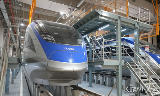 停放在车辆基地联合检修库里的京雄快线列车。
