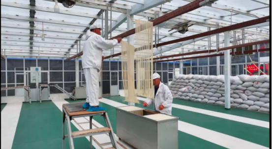 说话间,完成“上面筷”工序的面条被送入车间特有的土坯洞子醒发。这洞子由老师傅们亲手砌成,冬暖夏凉、温湿稳定,是醒发面的秘密武器。“老法子最养面,面条在这里醒发数小时后,需上架抻拉、再次醒发,每一步都遵循古法,容不得半点马虎。”张鹏说。