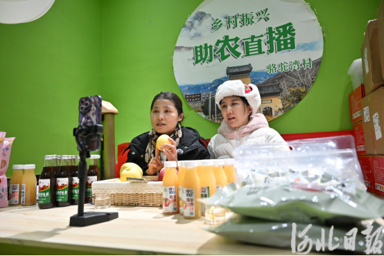 广场一侧的骆驼湾共享直播间里,摆满了太行山特产:阜平大枣、香菇、枣醋、枣夹核桃,还有带有骆驼湾标识的文创产品。