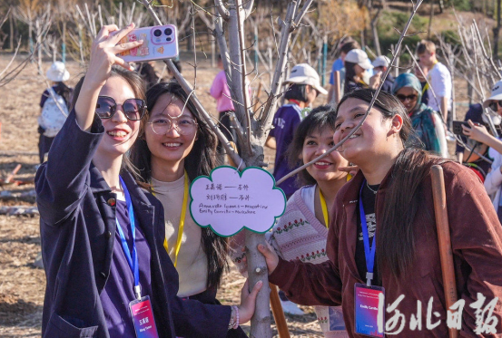 中美学生在正定园博园“中美友谊传承青年林”种下友谊之树并自拍留念。