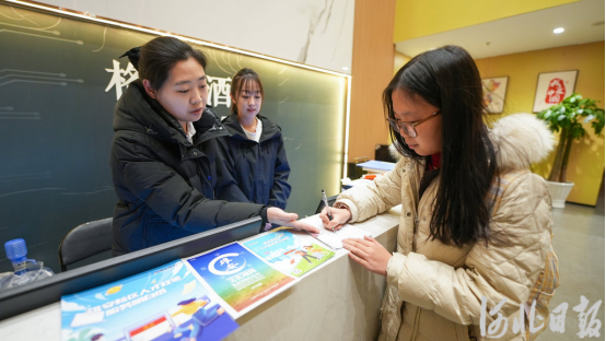 1月30日,东北财经大学研三学生顾子暄正在雄安新区一家青年人才驿站办理入住。