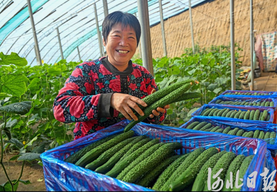 2月4日,深州市西凌消村农民刘青梅在大棚里采摘黄瓜。