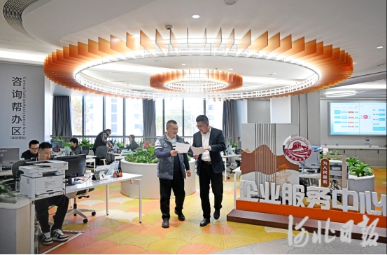 2025年11月21日,石家庄市政务服务中心工作人员(右一)为企业办事员提供服务。