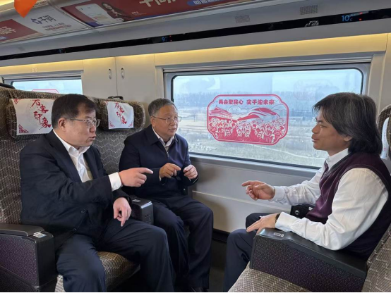 3月3日上午,报到途中,住冀全国政协委员在高铁列车上交流讨论。赵新宇摄