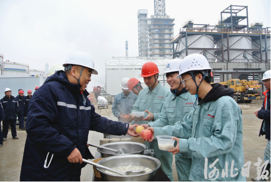 3月3日,在河北凯意新材料科技有限公司负极材料一体化项目建设现场,公司董事长刘全利(左)给施工人员盛元宵、发苹果。