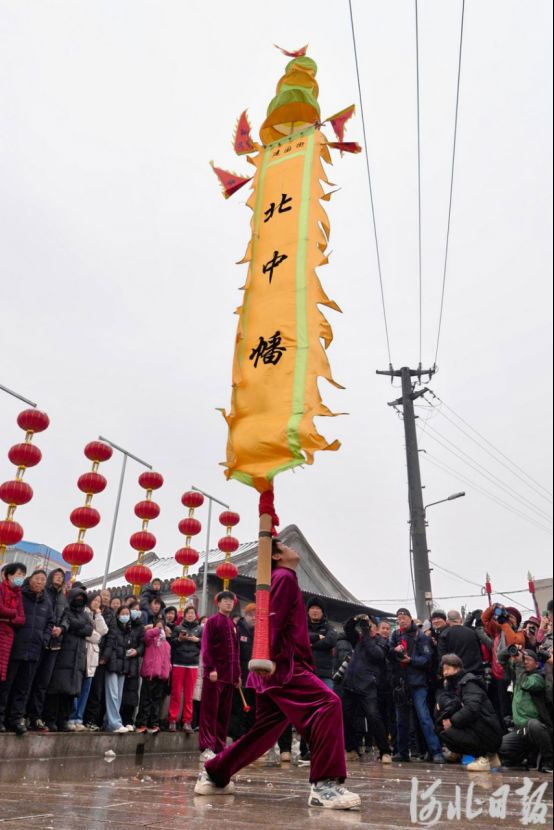 3月3日,霸州市胜芳古镇花会活动现场,胜芳北中幡会的演员正在表演。