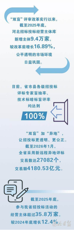 截至2025年底,参与我省招投标活动的经营主体超过35.8万家,较2024年底增长12.4%。河北探索实行的“双盲”评审改革,入选全国优化营商环境创新实践案例,成为招投标领域的行业标杆在全国推广。