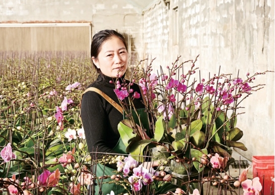 花农在双滦区偏桥子镇大贵口村蝴蝶兰种植基地管护蝴蝶兰。