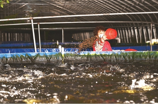 承德金稷家庭农场,“鱼菜共生”大棚内工作人员正在喂养加州鲈鱼。