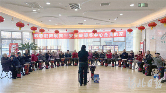 在北戴河区平安秦康颐养中心内,老人们在集体学习打手鼓。