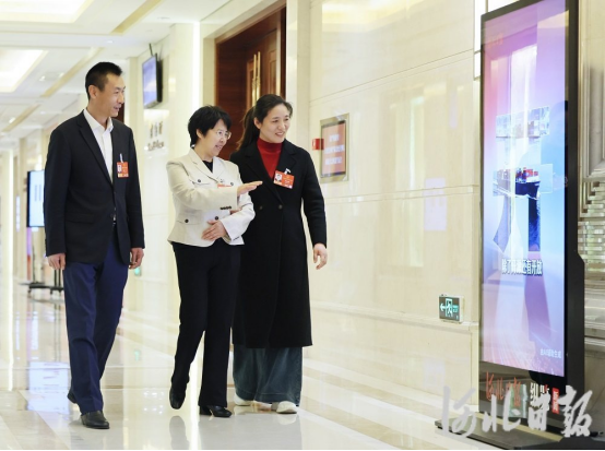 3月8日,在河北省代表团驻地,本报新媒体作品吸引代表们驻足观看。