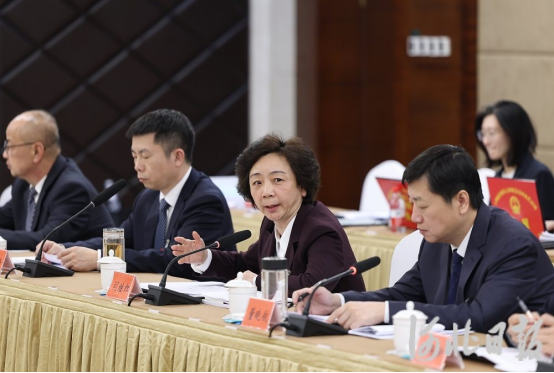 韩莉代表(前排右二)在河北省代表团开放团组活动中,回答记者提问。